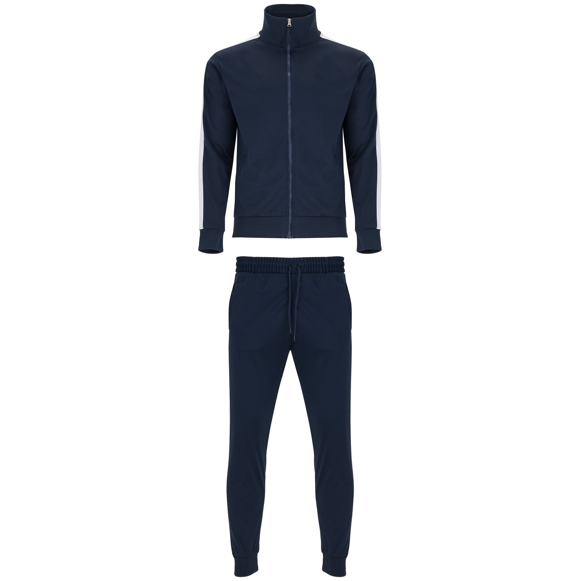 Col haut avec bande de propreté intérieur au ton. Col, poignets et bas en côte 1x1. Zip central au ton avec tireur. Poches laterales des veste avec zip. Panneau latérale en contraste. Pantalon avec ceinture élastique et cordon de serrage. Deux poches laterales. Poche arrière avec zip. Bas avec élastique en côte 1x1.